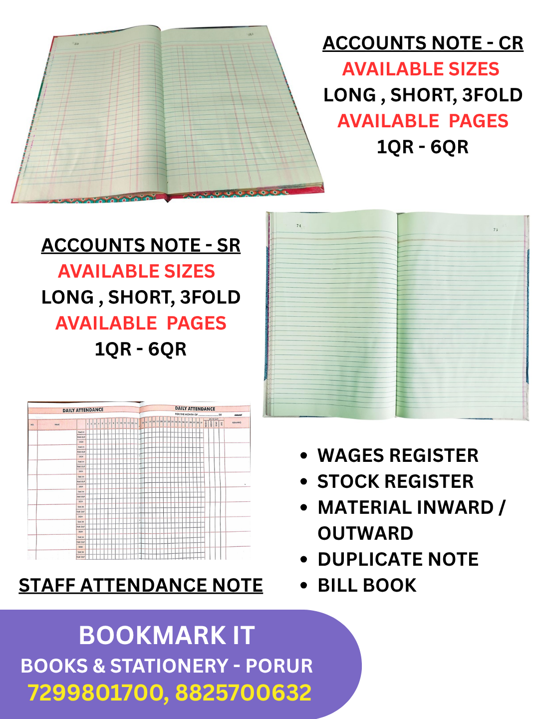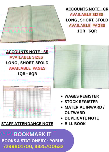 ACCOUTS NOTE - CREDIT / DEBIT , SINGLE RULED. OFFICE STAFF ATTENDANCE NOTE , WAGES REGISTER, STOCK REGISTERS, MATERIAL INWARD / MATERIAL OUTWARD, DUPLICATE NOTE, BILL BOOK, M-BOOK, TRIP BOOK, DELIVERY NOTE, ETC.