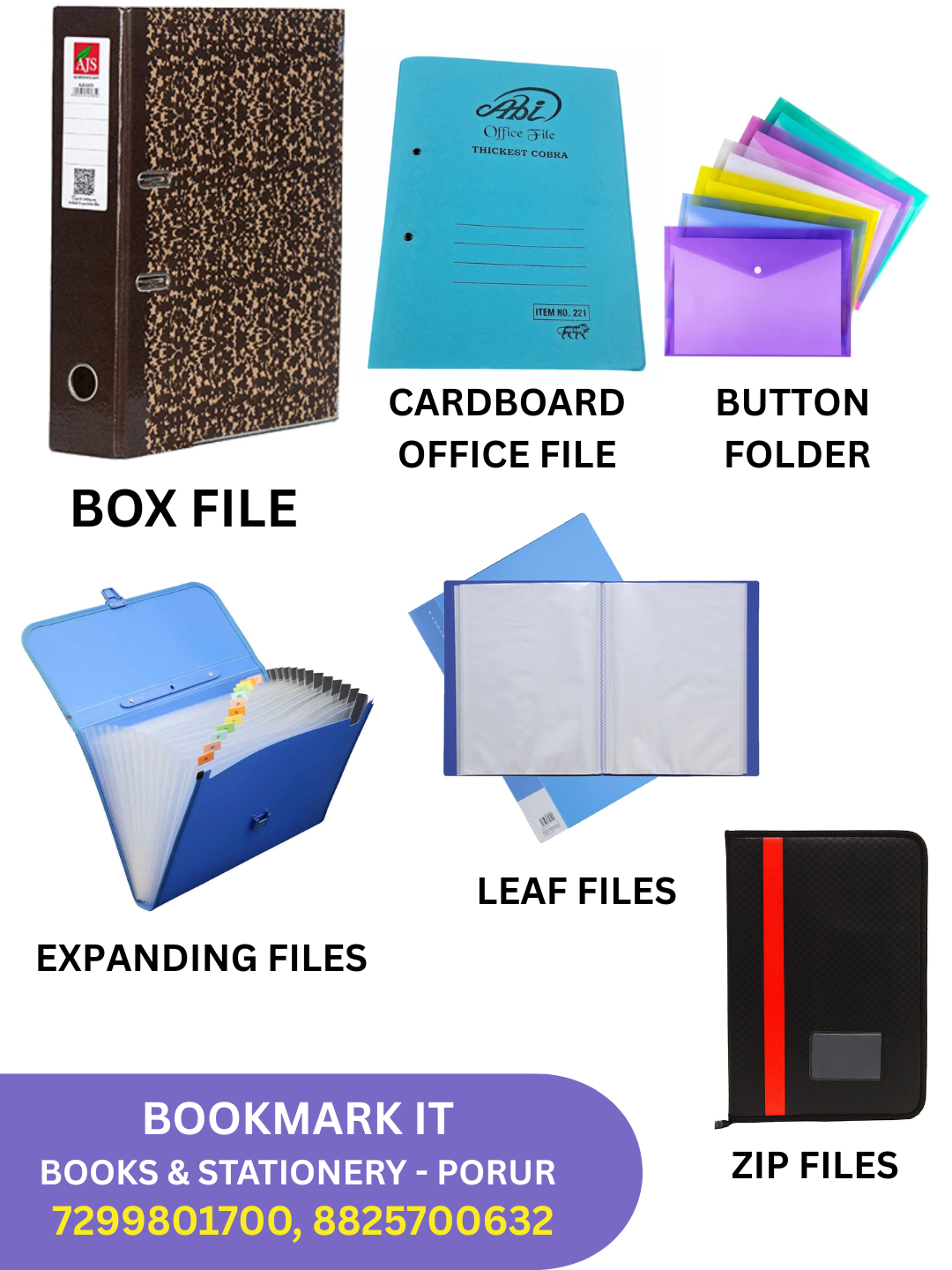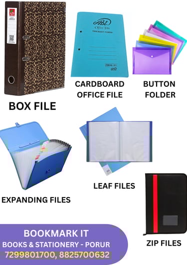 OFFICE FILES - BOX FILES , CARDBOARD FILES, ZIP FILES EXPANDING FILES, LEAF FILES, BUTTON FOLDERS, CERTIFICATE FILES, CLIP FILES, CHEQUE BOOK FOLDER, ETC.